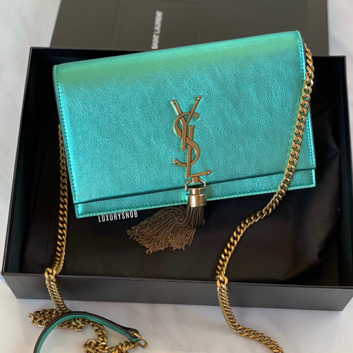 We guarantee this is an authentic Saint Laurent Kate Wallet on chain in emerald green or full money back. This product is brand new with dust bag....