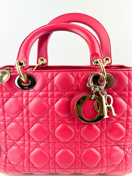 We guarantee this is an authentic Dior Lambskin Cannage Medium Lady Dior or full money back. Color is Pink. This product is in great condition wit...