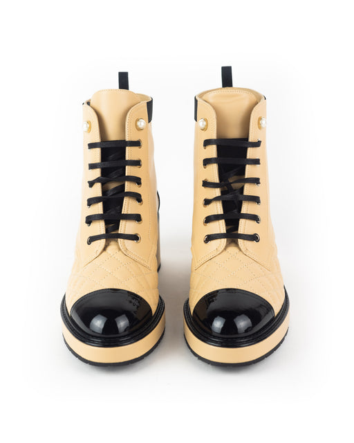 We guarantee this is an authentic Chanel Pearl Embellished Leather Lace-Ups in beige and black size 39 or full money back. This product is brand n...