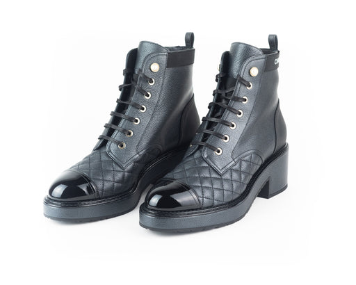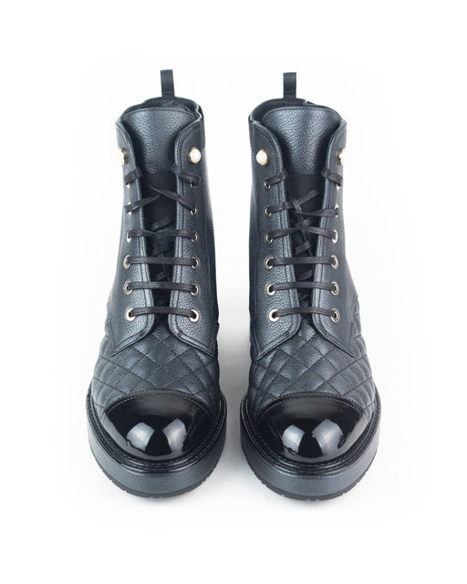 CHANEL CRACKLED CALFSKIN PEARL CHAIN CC BOOTS SIZE 40 - LuxurySnob