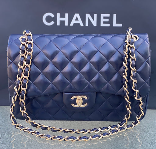 We guarantee this is an authentic CHANEL LAMBSKIN CLASSIC JUMBO DOUBLE FLAP BAG IN NAVY WITH LIGHT GOLD HARDWARE or full money back. This Product i...