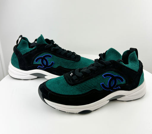 We guarantee this is an authentic Chanel Suede Calfskin and Fabric Sneakers in black and Green size 38.5 or full money back. This product is in gr...