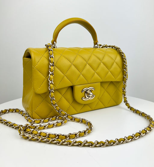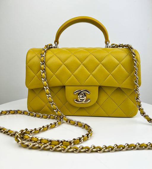 We guarantee this is an authentic Chanel Classic Mini Top handle Flap Bag in yellow or full money back. This product is in excellent condition wit...
