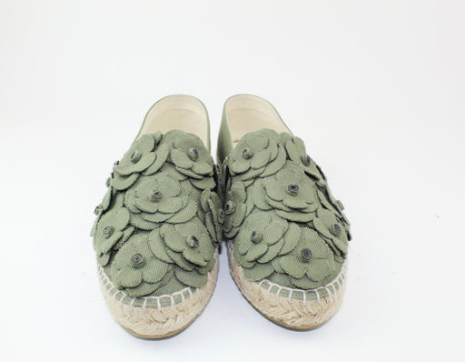 We guarantee this is an authentic Chanel Floral Canvas Espadrilles in sage green size 39 or full money back. This product is brand new with dust bag and box.