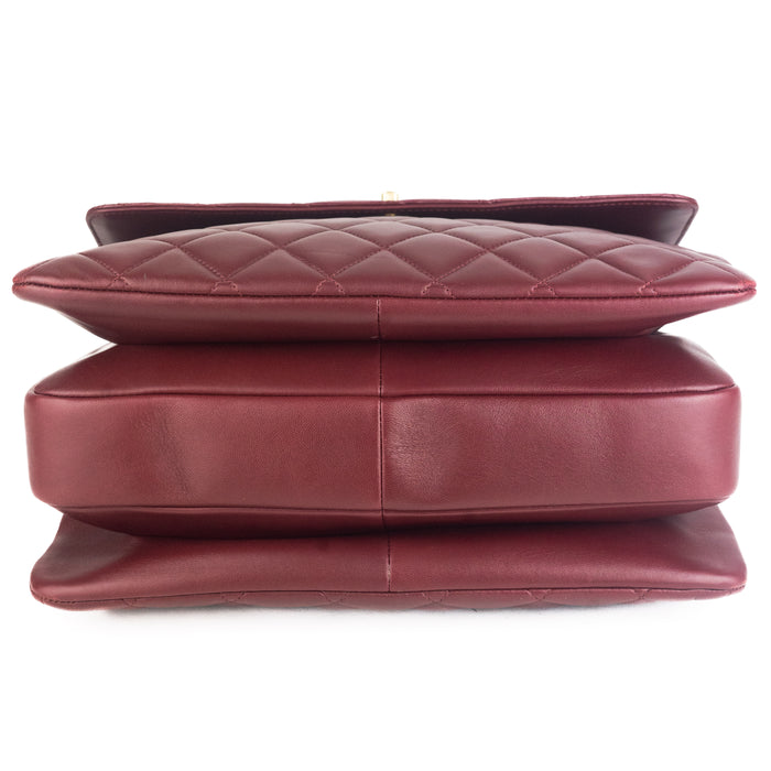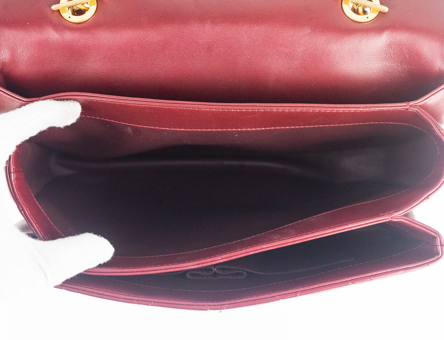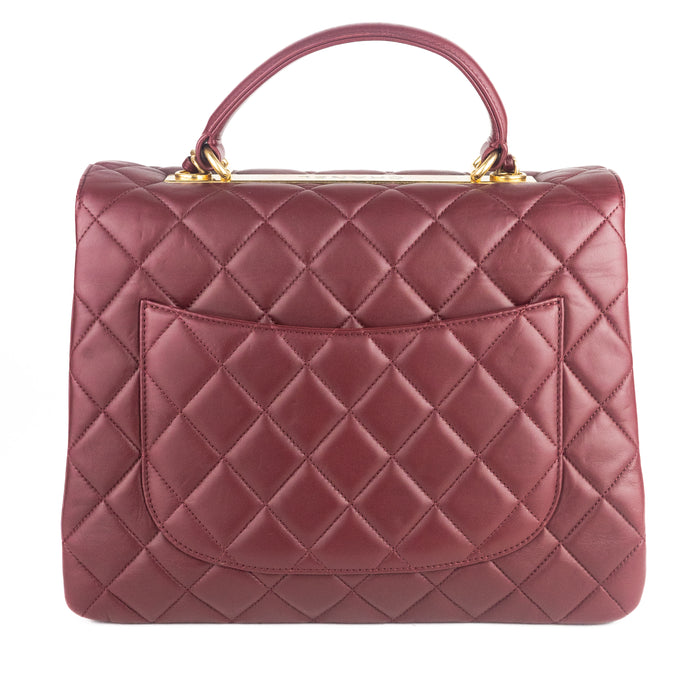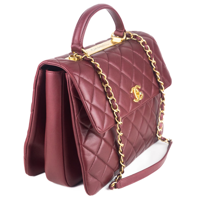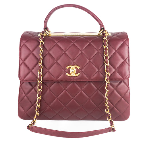 We guarantee this is an authentic Chanel Large Trendy CC  Lambskin Top Handle bag  in Burgundy with Gold hardware or full money back. This Product is in excellent condition with authenticity card. Has scratches and stains in the inside flap , discoloration on outside corners. Slight wear on handles.. no box or dust bag.